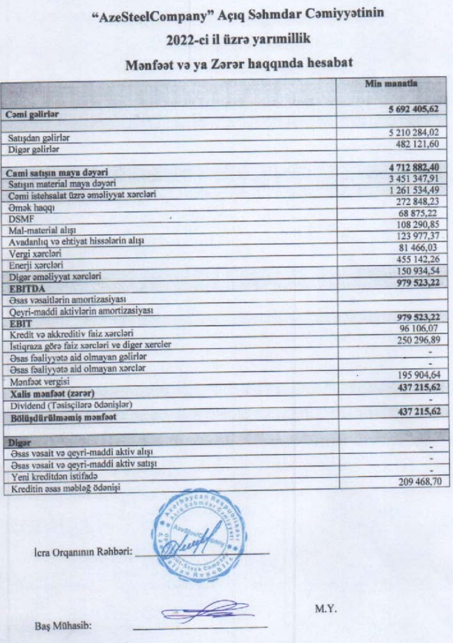 Marja.az-ın məlumatına görə, 2022-ci ilin ilk yarsını 437 min manat xalis mənfəət ilə başa vurmuş "AzeSteelCompany", 2023-cü ilin birinci yarısında 1 milyon 511 min manat zərər ilə üzləşib.