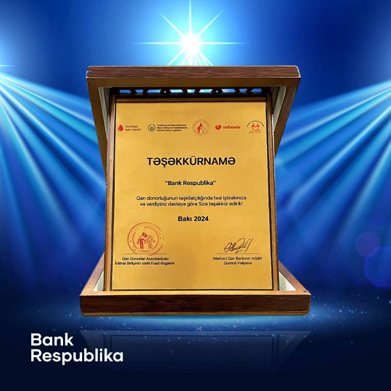 Azərbaycanda qan donorluğunun inkişafında fəal iştirakına və verdiyi dəstəyə görə Bank Respublika xüsusi təşəkkürnamə ilə təltif edilib.