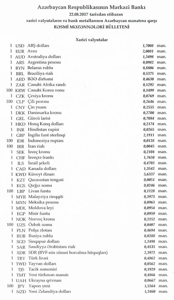 Avqustun 21-də rəsmi olaraq 1 dollar 1,7008 manata, 1 avro isə 1.9988 manata bərabər idi.