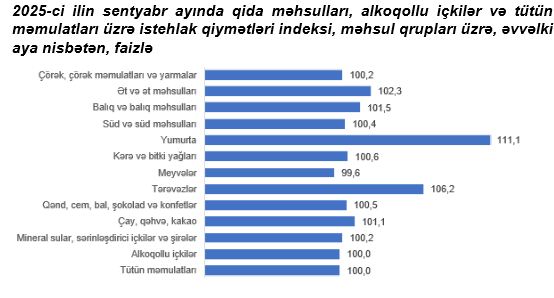 2025-ci ilin sentyabr ayında qida məhsulları, alkoqollu içkilər və tütün məmulatları üzrə istehlak qiymətləri indeksi əvvəlki aya nisbətən 1,8 faiz, yanvar-sentyabr aylarında isə əvvəlki ilin müvafiq dövrünə nisbətən 6,7 faiz qalxıb.
