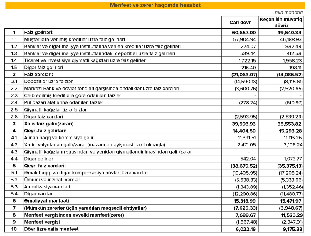 Bankın faiz gəlirləri 2025-ci ilin yanvar–sentyabrında 60 milyon 657 min manat təşkil edib. Bu, 2024-cü ilin eyni dövrü ilə müqayisədə (49 milyon 640 min manat) 11 milyon 17 min manat və ya 22,2% artım deməkdir.