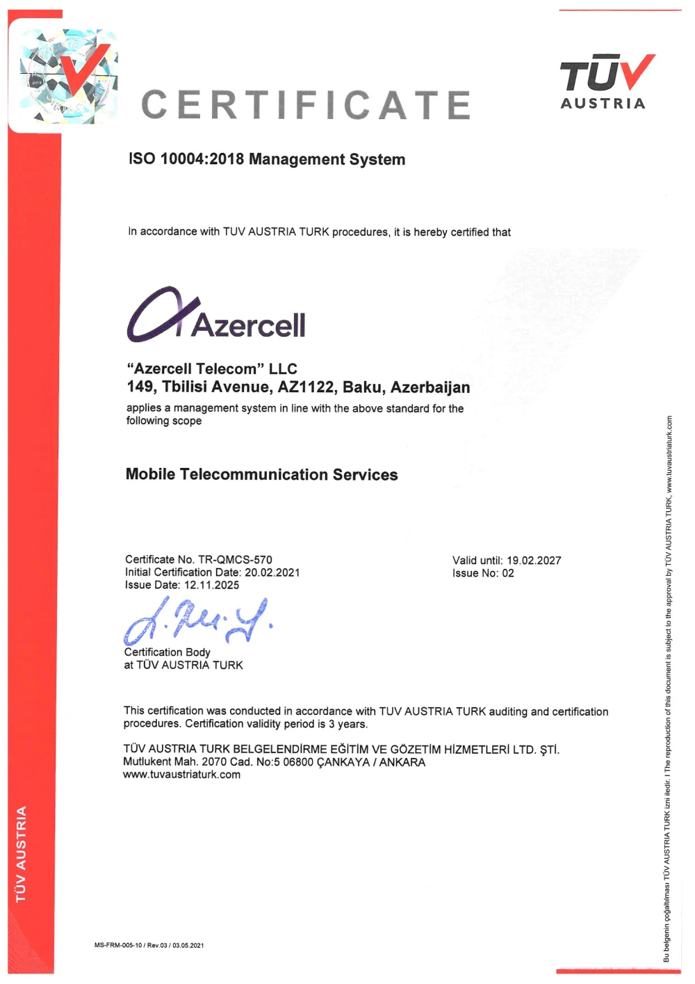 Dəyərləndirmə zamanı Azercell-in müştəri məmnuniyyətini daim diqqət mərkəzində saxladığı, müştəriyönümlü yanaşması və xidmət keyfiyyətinə sadiqliyi bir daha təsdiqlənib. Sertifikatlaşdırma prosesi “TÜV Austria Azərbaycan” MMC tərəfindən həyata keçirilib.