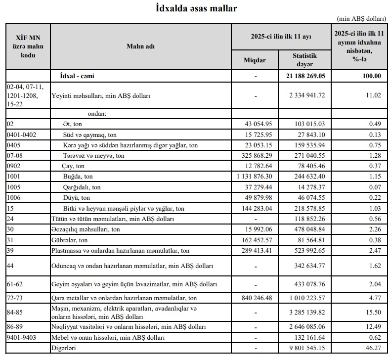 2025-cü ilin yanvar-noyabr aylarında (11 ayda) Azərbaycanın ən çox ixrac və idxal etdiyi mallar.