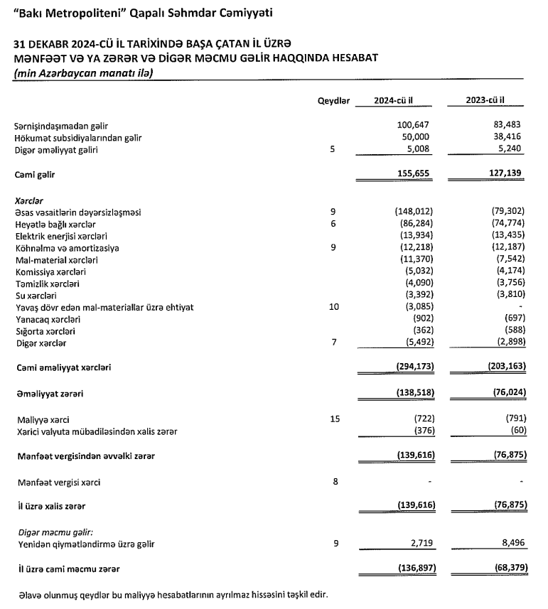 31 dekabr 2024-cü il tarixində "Bakı Metropoliteni"nin yığılmış zərəri 3 milyard 109 milyon 540 min manata çatıb (2023-cü ilin sonunda 2 milyard 969 milyon 924 min manat).