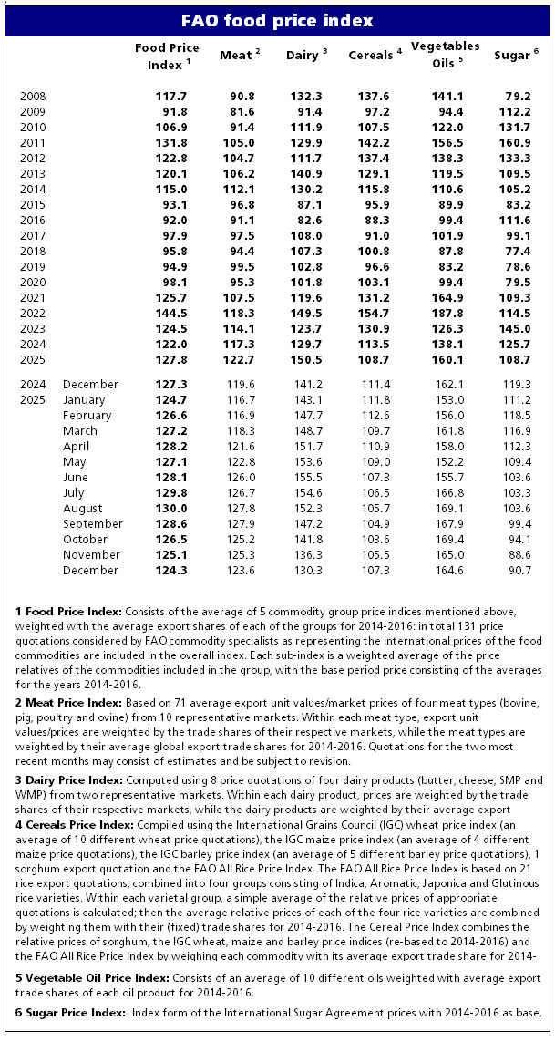 FAO ərzaq qiymətləri 2025 qlobal ərzaq qiymətləri azalıb FAO Ərzaq Qiymətləri İndeksi dekabr dünya ərzaq bazarı 2025 qlobal inflyasiya ərzaq qiymətləri taxıl qiymətləri FAO buğda və qarğıdalı qiymətləri düyü qiymətləri 2025 FAO düyü indeksi bitki yağları qiymətləri son vəziyyət palma yağı qiymətləri soya yağı bazarı günəbaxan yağı qiymətləri FAO ət qiymətləri indeksi mal əti və quş əti qiymətləri süd məhsulları qiymətləri FAO kərə yağı və süd tozu qiymətləri şəkər qiymətləri 2025 qlobal şəkər bazarı ərzaq bazarında son tendensiyalar dünya ərzaq qiymətləri xəbərləri Marja.az FAO analizi