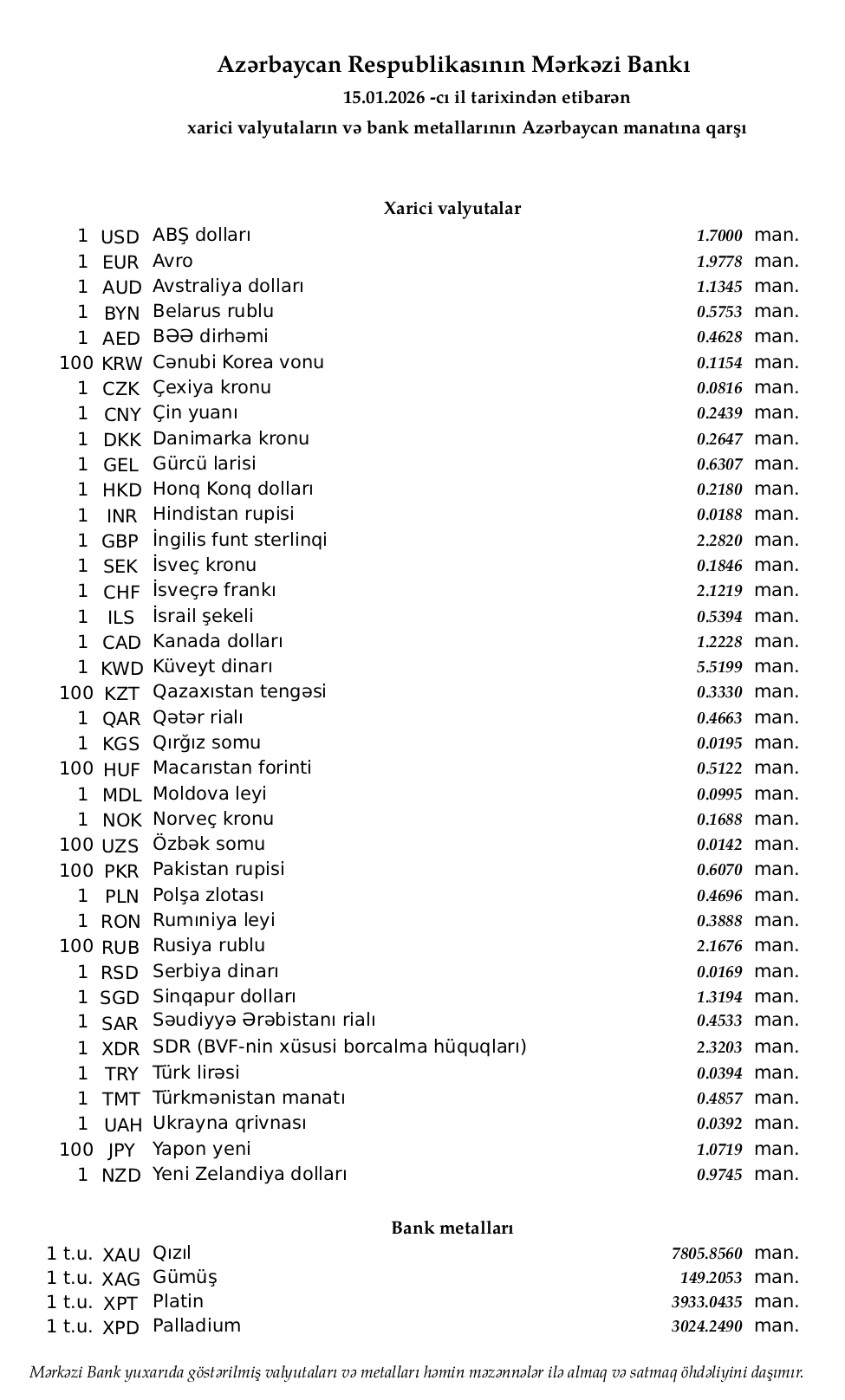 Rəsmi məzənnələr açıqlandı