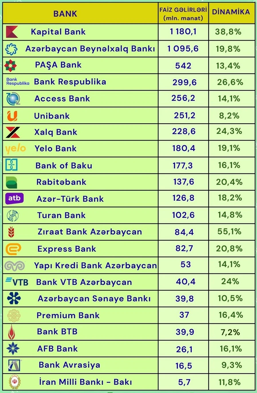 azərbaycan banklar faizgəlirləri 2025 kapitalbank 1180 1milyon azərbaycanbeynəlxalqbankı 1095 6milyon paşabank 542 1milyon bankrespublika 299 6milyon accessbank 256 2milyon 17bank 100-255milyon 9bank 10-100milyon 1bank 10milyonmanatdanaz dinamikafaiz ziraatbankazərbaycan 55 1% bankbtb 4 7% iqtisadiyyat banksektoru maliyyə
