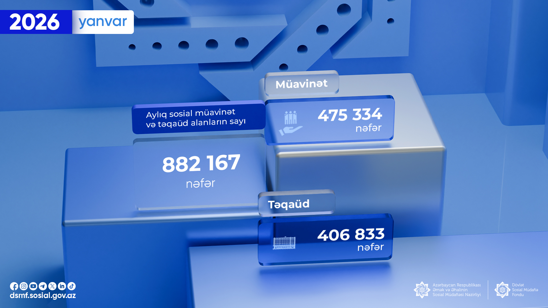 2026-cı ilin yanvar ayında aylıq sosial müavinət və təqaüd alanların sayı 882 167 nəfər olub.