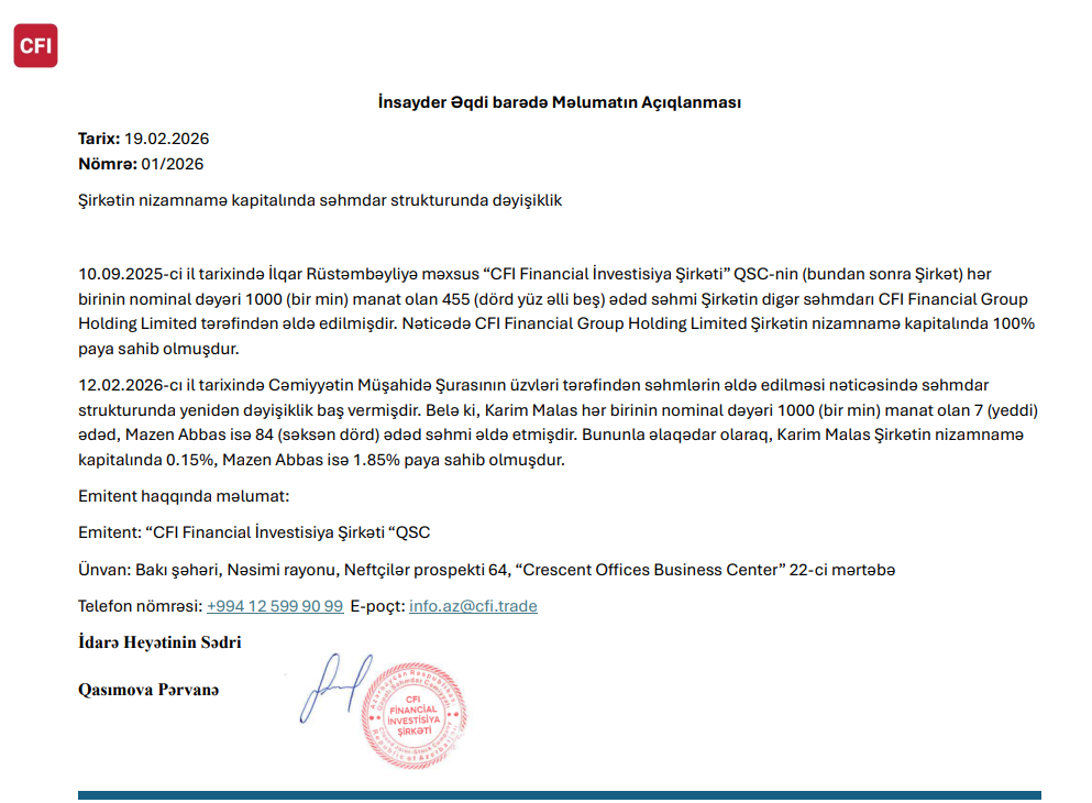 Xatırladaq ki, "CFI Financial İnvestisiya Şirkəti" 2014-cü ildən fəaliyyət göstərən "Azfinance İnvestisiya Şirkəti" QSC-nin bazasında 2024-cü ildə yaradılıb. Onun nizamnamə kapitalı 4,55 milyon manatdır.