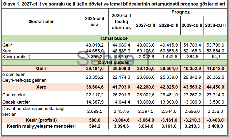 Maliyyə Nazirliyi 2027-ci il və sonrakı üç il üçün dövlət və icmal büdcələrinin ortamüddətli (2027-2030-cu illər) proqnoz göstəriciləri açıqlayıb.