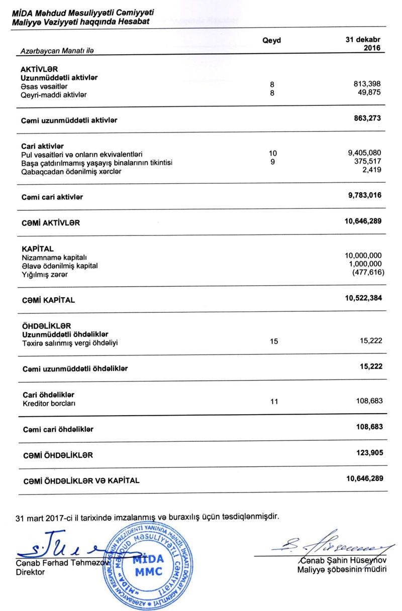 2016-cı ilin sonuna "MIDA"nın kapitalı 10 milyon 522,384 min manat, öhdəlikləri 123,905 min manat təşkil edib.