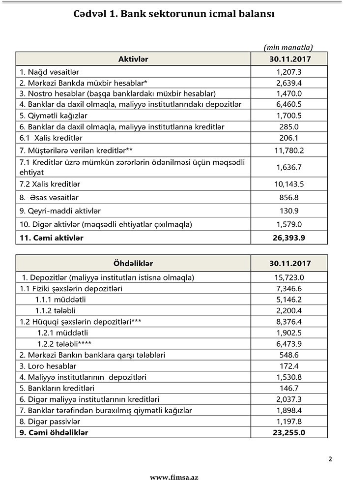 30 noyabr 2017-ci il tarixinə bank sektorunun əsas göstəriciləri bank sektorunun icmal göstəricilərində öz əksini tapmışdır.