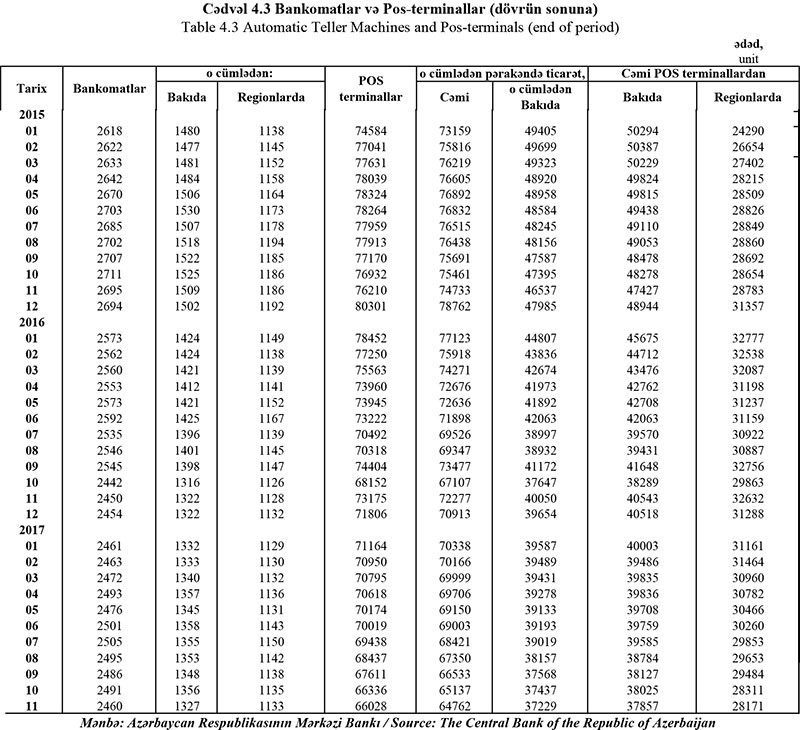 Pos-terminalların sayı 2017-ci ilin 11 ayı ərzində 5778 ədəd, Noyabrda isə Oktyabr ayı ilə müqayisədə 308 ədəd azalıb.