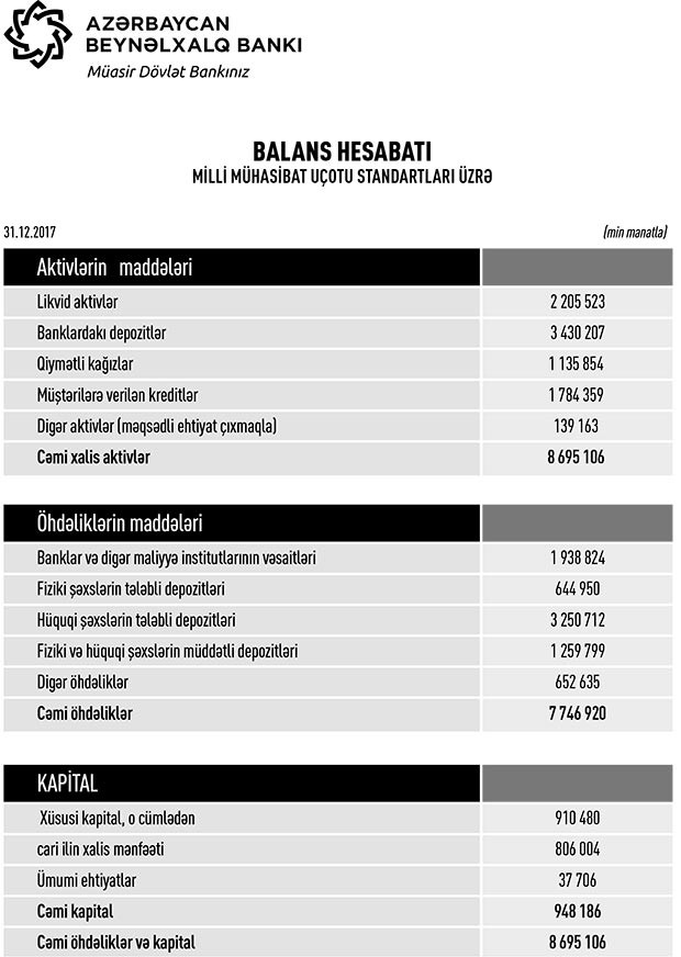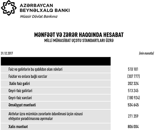 “Azərbaycan Beynəlxalq Bankı” (ABB) 2017-ci ili 806 milyon 4 min manat xalis mənfəətlə başa vurub.