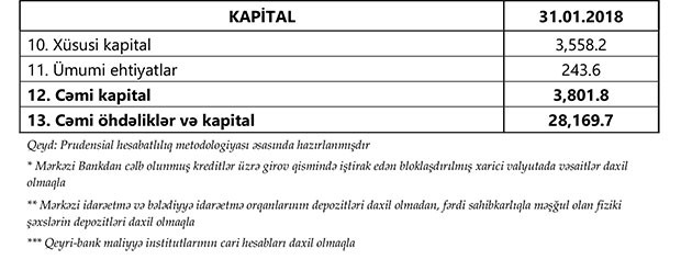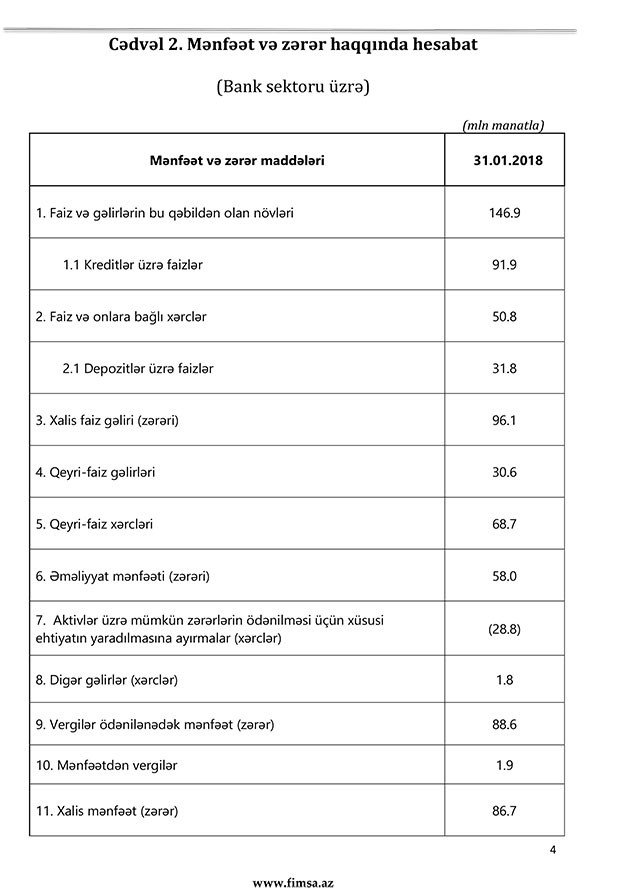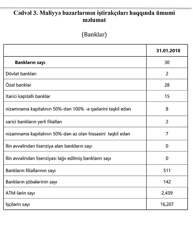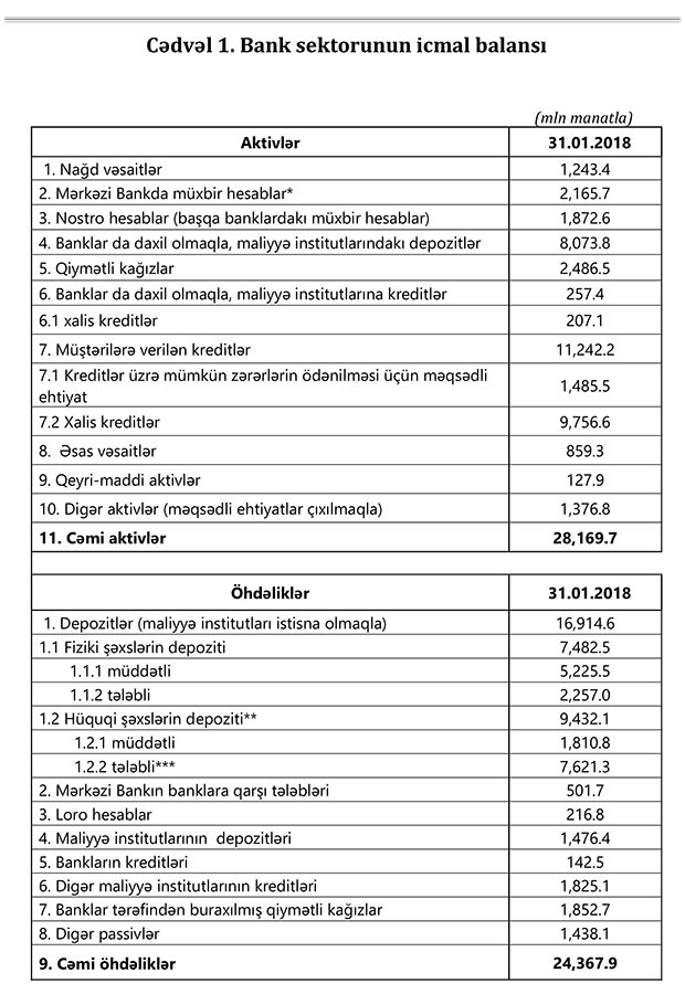 31 yanvar 2018-ci il tarixinə bank sektorunun əsas göstəriciləri bank sektorunun icmal göstəricilərində öz əksini tapmışdır.