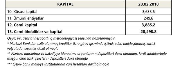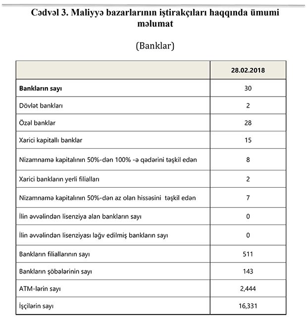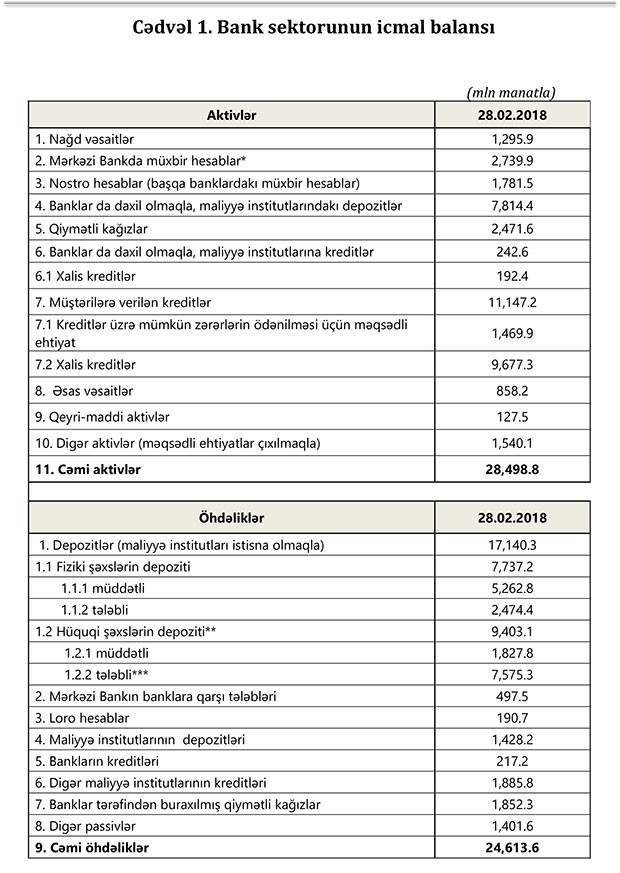 28 fevral 2018-ci il tarixinə bank sektorunun əsas göstəriciləri bank sektorunun icmal göstəricilərində öz əksini tapmışdır.