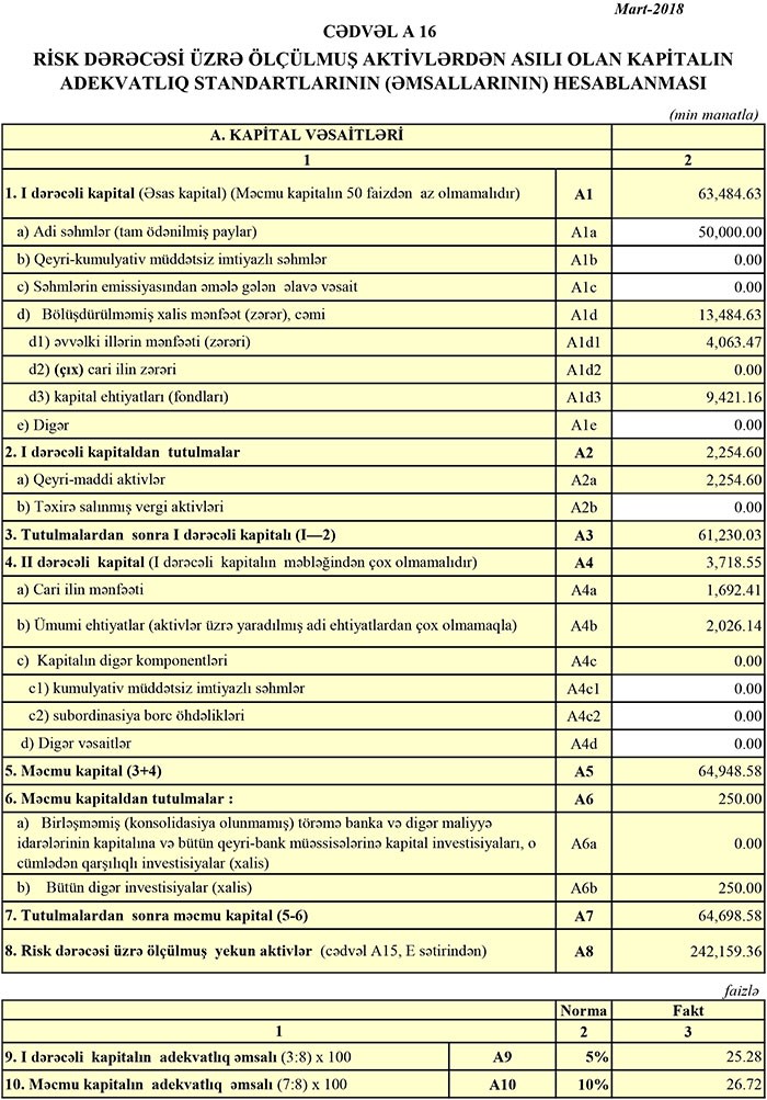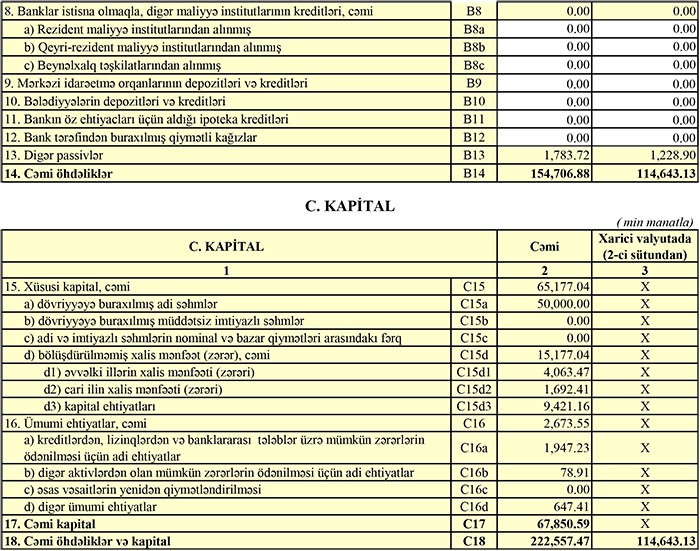2017-ci ilin sonunda Bank 186 milyon 665 min manat cəmi aktivlərə, 65 milyon 895 min manat cəmi balans kapitalına və 120 milyon 769 min manat cəmi öhdəliklərə malik idi.