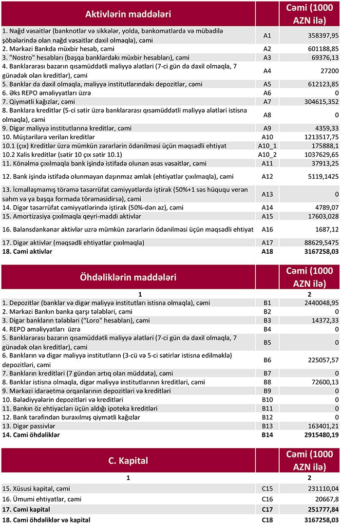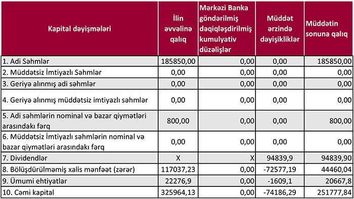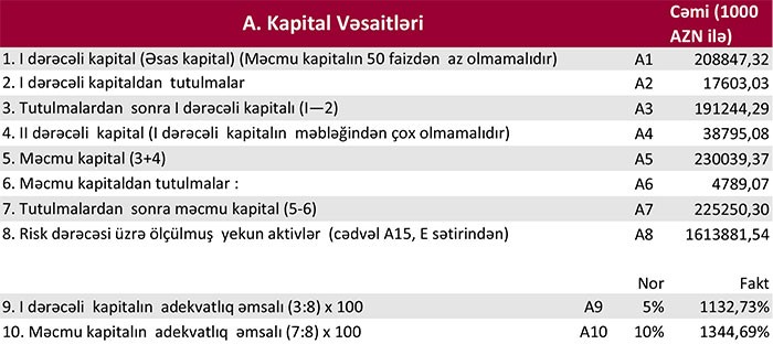 Bankın 1 aprel 2018-ci il tarixinə tutulmalardan sonra məcmu kapitalı 225,3 milyon manat, nizamnamə kapitalı isə 185,9 milyon manat təşkil edir.