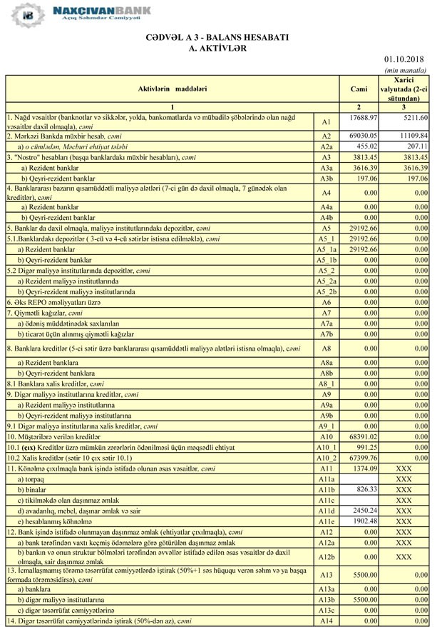 01.10.2018-ci il tarixində "Naxçıvanbank" 194 milyon 863 min manat cəmi kativlərə (o cümlədən 68391 min manatı müştərilərə verilmiş kreditlər), 117 milyon 602 min manat cəmi öhdəliklərə və 77 milyon 260 min manat cəmi balans kapitalına malik olub.