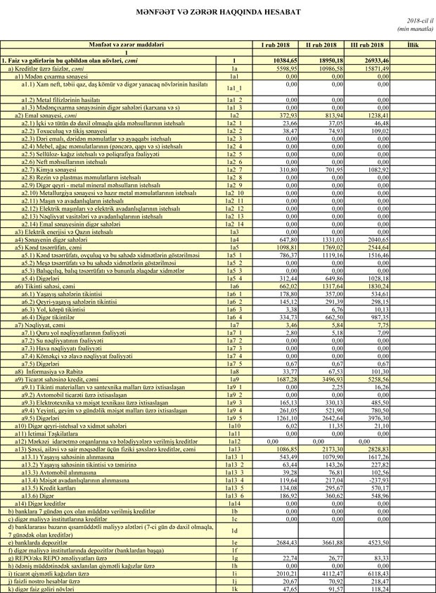 Ötən ilin yanvar-sentyabr dövründə kreditlər üzrə faizlər 14 milyon 713 min manat, banklarda depozitlərdən gəlir 1 milyon 422 min manat,  ticarət qiymətli kağızları üzrə gəlir 1 milyon 391 min manat təşkil editmişdi.