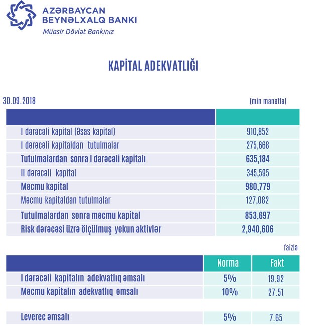 30.09.2018-ci il tarixində ABB-nin cəmi aktivləri 8 milyard 320 milyon manat, cəmi öhdəlikləri 7 milyard 40 milyon manat, cəmi balans kapitalı isə 1 milyard 280 milyon manat təşkil edib.