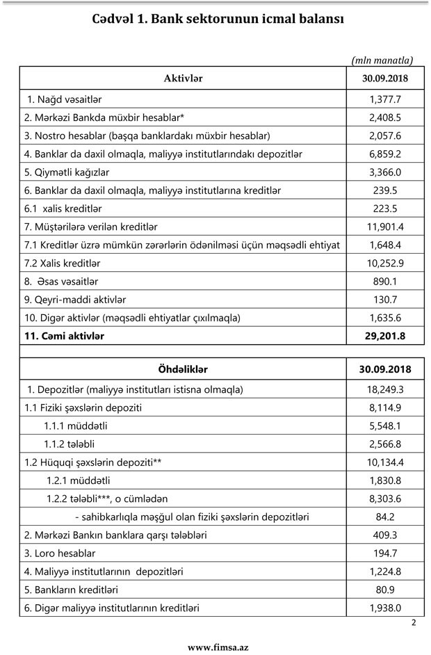 2018-ci ilin sentyabr ayı ərzində bank sektorunun aktivləri 3.8% (1 milyard 74.7 milyon manat), öhdəlikləri 4.2% (1 milyard 11.5 milyon manat), balans kapitalı isə 1.6% (63.2 milyon manat) artıb.