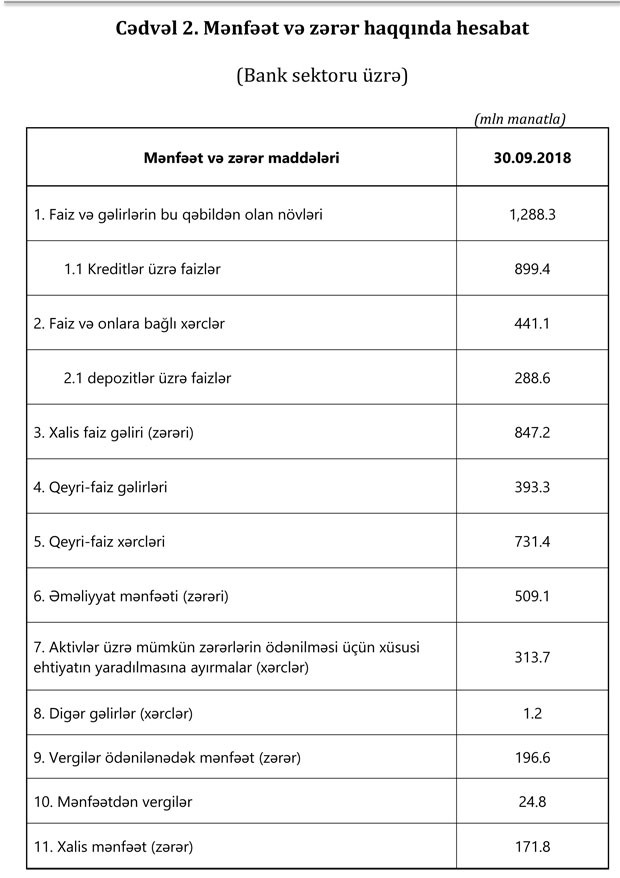 Bank sektoru cari ilin 9 ayı ərzində 509.1 milyon manat əməliyyat mənfəəti, 171.8 milyon manat xalis mənfəət generasiya edib.