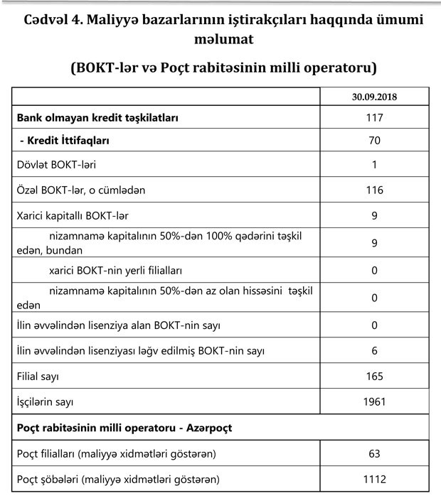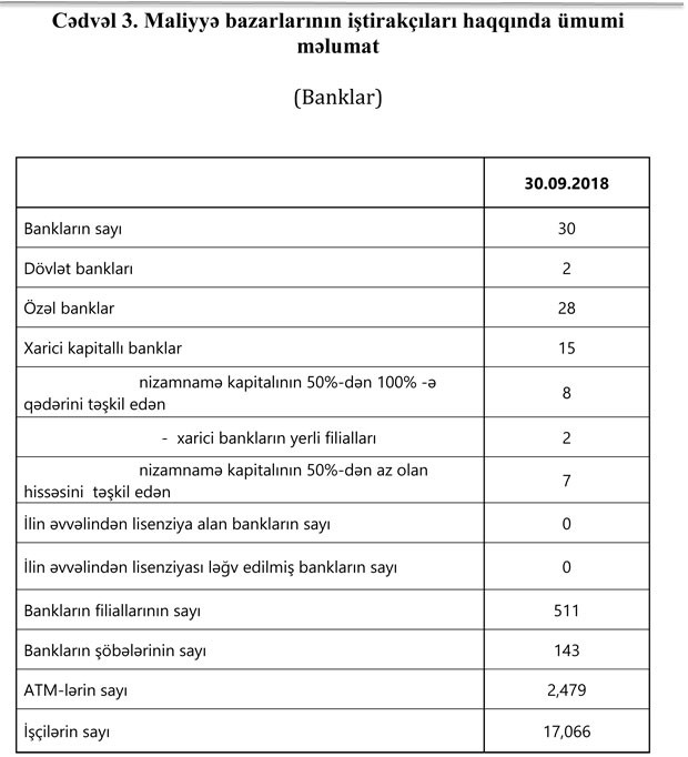 Fəaliyyət göstərən 30 bankın filiallarının sayı 511, şöbələrinin sayı 143, ATM-lərin sayı 2 479 olub.