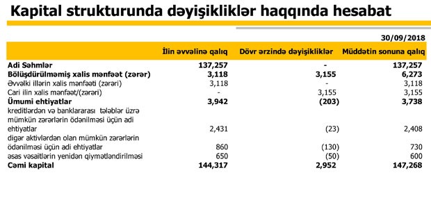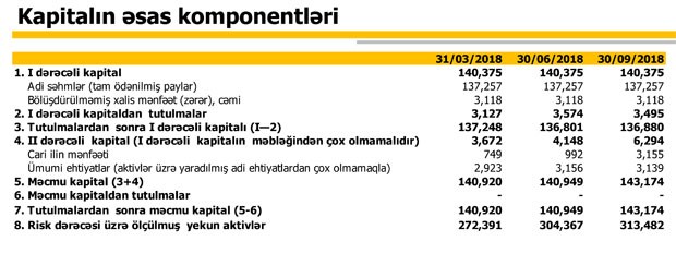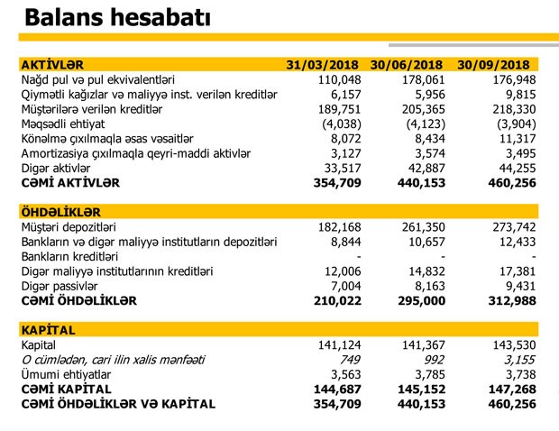30 Sentyabr 2017-ci il tarixində 295 milyon 369 min manat təşkil etmiş cəmi aktivlər 30 Sentyabr 2018-ci il tarixində 460 milyon 256 min manata çatıb. Aktivlərin tərkibində nağd pul və müştərilərə verilən kreditlər daha çox artıb.