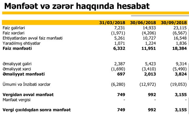 - İllik xalis mənfəət 3 milyon 155 min manat olub, kapitalın illik gəlirliyi (ROE – 2.9%) 2017-ci il ilə müqayisədə 104% artım əks etdirmişdir.