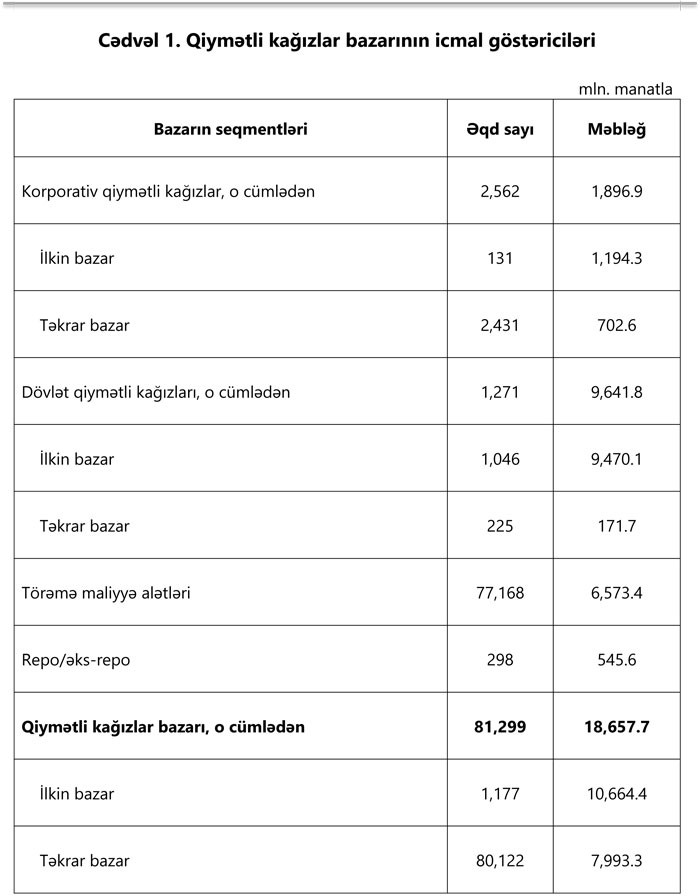 2018-ci ilin 9 ayı ərzində qiymətli kağızlar bazarında ümumilikdə 18 mlrd. 657.7 mln. manat həcmində əməliyyat aparılıb ki, bu da ötən ilin müvafiq dövrü ilə müqayisədə 2 dəfə çoxdur. Artımın əsas səbəbi Mərkəzi Bankın notları və Maliyyə Nazirliyinin istiqrazlarıdır.