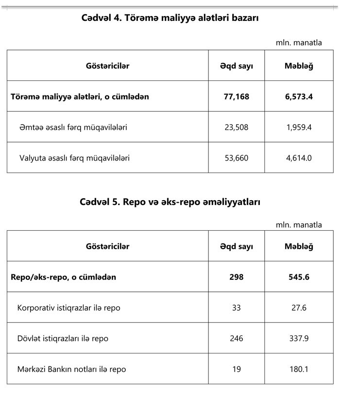 Maliyyə Bazarlarına Nəzarət Platasının hesabatına görə, əməliyyatların 57.2%-i (10 mrd. 664.4 mln. manat) ilkin bazarda, 42.8%-i (7 mlrd. 993.3 mln. manat) isə təkrar bazarda aparılıb.