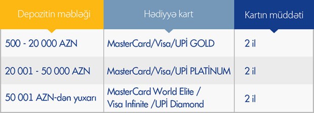Tələbli əmanət yerləşdirən müştəri, əmanətin məbləğinə uyğun olaraq pulsuz plastik kartla təmin olunur.
