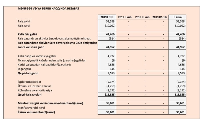 Həmçinin, Bank bu il faiz qazandıran aktivlər üzrə dəyərsizləşmə üçün ehtiyata cəmi 514 min manat ayırıb. Ötən ilin ilk rübündə ayırmanın məbləğ 14 milyon 166 min manat təşkil etmişdi.