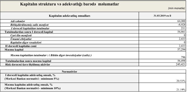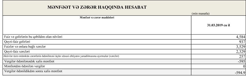 Müqayisə üçün qeyd edək ki, “NBC Bank” ASC 2018-ci ilin 1-ci rübünü 818,1 min manat xalis mənfəət ilə başa vurmuşdu. Ötən ilin ilk 3 ayında “NBC Bank”ın cəmi gəlirləri 4 milyon 613 min manat, cəmi xərcləri 3 milyon 938 min manat, əməliyyat mənfəəti 675 min manat təşkil etmişdi. Həmçinin ehtiyatlardan 144 min manat gəlirə əlavə edilmişdi.