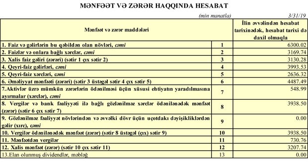 Müqayisə üçün qeyd edək ki, 2018-ci ilin 1-ci yrübündə “Azərbaycan Sənaye Bankı”nın cəmi gəlirləri 8 milyon 90 min manat, cəmi xərcləri 6 milyon 25 min manat, əməliyyat mənfəəti 2 milyon 64 min manat təşkil etmişdi. Bank əməliyyat mənfəətinin 375 min manatını ehtiyata ayırdığından həm dövrü 1 milyon 689 min manat xalis mənfəət ilə bağlamışdı.