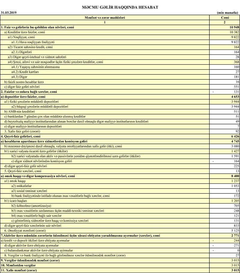 “Premium Bank” ASC 2019-cu ilin 1-ci rübünü 3 milyon 15 min manat xalis mənfəət ilə başa vurub. Halbuki, Bank 2018-ci ilin 1-ci rübünü 11 milyon 679 min manat xalis mənfəətlə bağlamışdı. Beləliklə, “Premium Bank”ın xalis mənfəəti 3,9 dəfə azalıb.