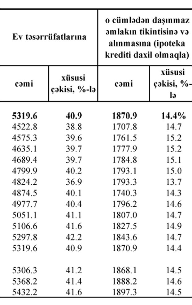 “Marja” Mərkəzi Bankın statistikasına istinadən xəbər verir ki, ev təsərrüfatlarına verilən kreditlərdəki 112,6 milyon manatlıq artımın 26,4 milyon manatı daşınmaz əmlakın tikintisinə və alınmasına (ipoteka krediti daxil olmaqla) verilən kreditlər ilə bağlıdır.