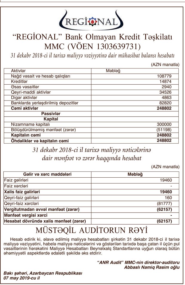 “Regional” Bank Olmayan Kredit Təşkilatı MMC 2018-ci ili 62 min 157 manat zərər ilə başa vurub.