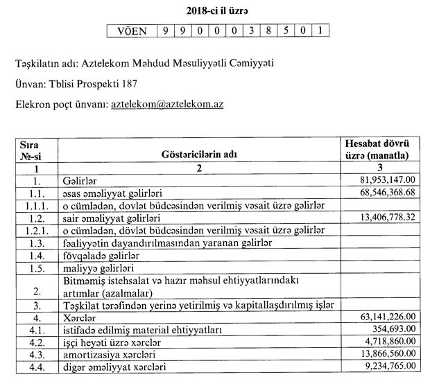 “Aztelekom” MMC 2018-ci ili 18 milyon 812 min manat xalis mənfəət ilə başa vurub. Müqayisə üçün qeyd edək ki, MMC 2017-ci ili 5 milyon 647 min manat xalis mənfəət ilə bağlamışdı. Beləliklə, illik müqayisədə “Aztelekom”un xalis mənfəəti 3,3 dəfə artıb.