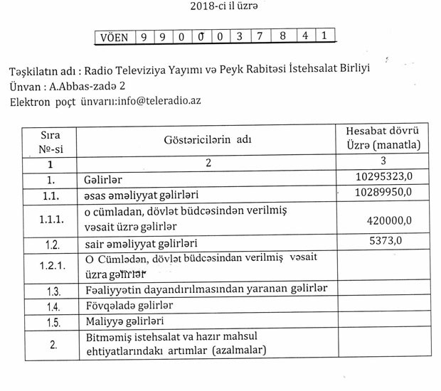 “Teleradio” İstehsalat Birliyi 2018-ci ili 343 min manat xalis mənfəət ilə başa vurub. Birlik 2016-cı ili 1 milyon 116 min manat, 2017-ci ili 115 min manat zərər ilə başa vurmuşdur.
