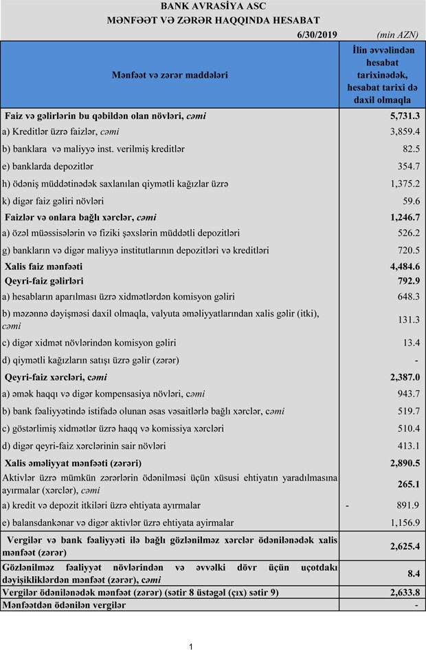 “Bank Avrasiya” ASC 2019-cu ilin 1-ci yarısını 2 milyon 634 min manat xalis mənfəət ilə başa vurub. Bu, 2019-cu ilin eyni dövrü ilə müqayisədə 2 milyon 12 min manat və ya 43,3% azdır. Belə ki, Bank 2018-ci ilin 1-ci yarısını 4 milyon 645 min manat xalis mənfəət ilə bağlamışdı.
