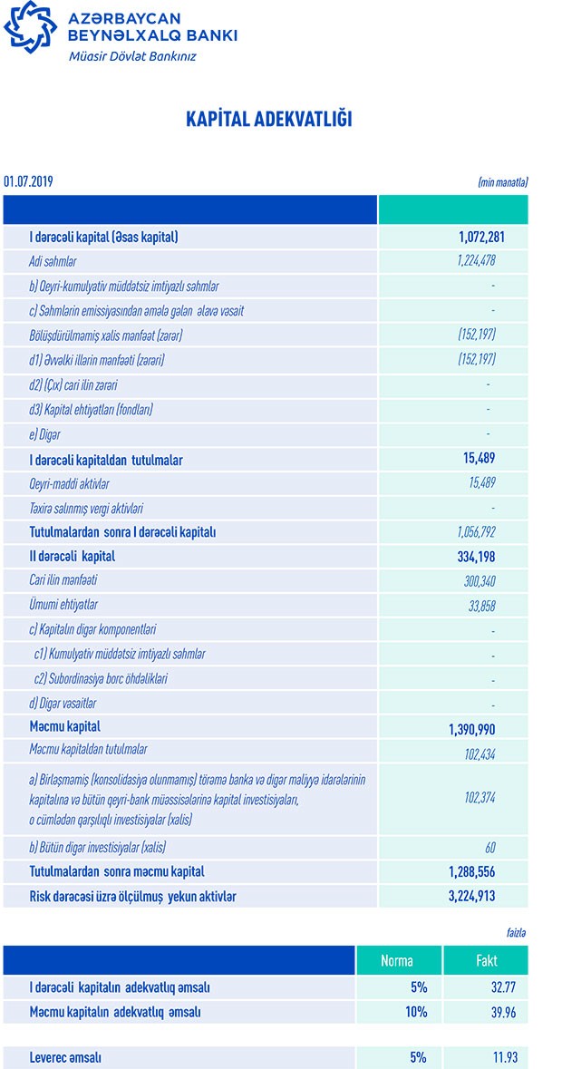 Qeyd edək ki, 1992-ci ildən fəaliyyət göstərən “Azərbaycan Beynəlxalq Bankı” ASC-nin nizamnamə kapitalının (1 milyard 224 milyon 478 min manat) 95.15%-i dövlət müəssisələrinə (Maliyyə Nazirliyi - 91.40%, Əmlak Məsələri Dövlət Komitəsi - 3.76%), 0.13%-i “Aqrarkredit”ə, 0.32%- hüquqi şəxslərə və 4.39%-i fiziki şəxslərə məxsusdur.