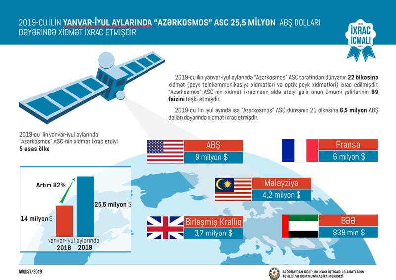2019-cu ilin iyul ayında isə “Azərkosmos” ASC dünyanın 21 ölkəsinə 6,9 milyon ABŞ dolları dəyərində xidmət ixrac edilib. “Azərkosmos” ASC-nin 2019-cu ilin yanvar-iyul aylarında xidmət ixracı həyata keçirdiyi əsas ölkələr ABŞ, Fransa, Malayziya, Birləşmiş Krallıq, BƏƏ-dir.