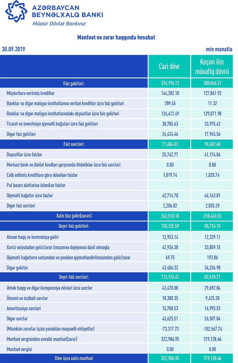Müqayisə üçün qeyd edək ki, 2018-ci ilin 9 ayında “Azərbaycan Beynəlxalq Bankı”nın cəmi gəlirləri 389 milyon 582 min manat, cəmi xərcləri 173 milyon 20 min manat, əməliyyat mənfəəti isə 216 milyon 562 min manat təşkil etmişdi. Həmin dövrdə ehtiyatdan 102 milyon 567 min manatın qayıtması hesabına mənfəət 319 milyon 128 min manata yüksəlmişdi.