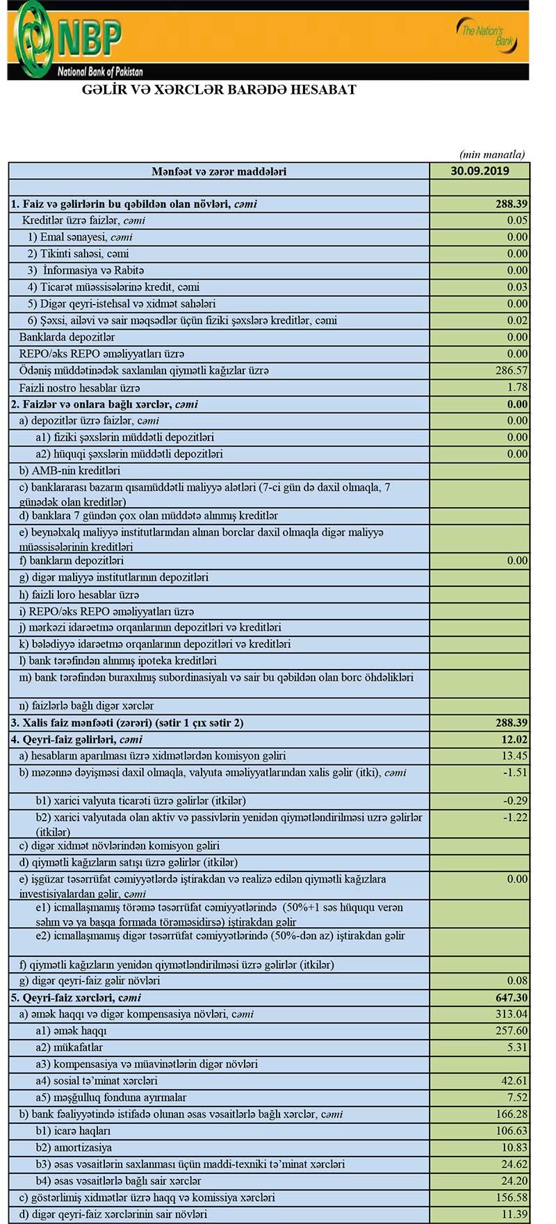 Pakistan Milli Bankının Bakı filialı (NBP Baku) 2019-cu ilin 9 ayını 297 min manat zərər ilə başa vurub.