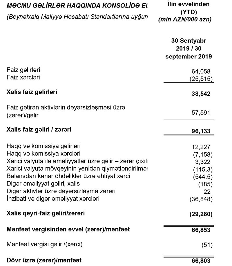 Müqayisə üçün qeyd edək ki, 2018-ci ilin 9 ayında “Unibank”ın cəmi gəlirləri 48 milyon 825 min manat, cəmi xərcləri (faiz, qeyri-faiz, inzibati və s.) isə 54 milyon 384 min manat təşkil edtmişdi. Nəticədə 5 milyon 559 min manat əməliyyat zərəri yaranmışdı. Lakin, ehtimal olunun kredit itkiləri üçün əvvəlki dövrlərdə yaradılmış ehtiyatdan azad olmuş 39 milyon 732 min manatı hesabına həm əməlyyat zərəri bağlanmış, həm də 34 milyon 110 min manat xalis mənfəət təmin edilmişdi.