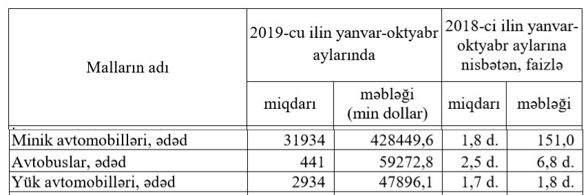 Hesabat dövründə Azərbaycana 47 milyon 896 min dollar dəyərində (artım 1,8 dəfə) 2934 ədəd yük avtomobili (artım 1,7 dəfə), 59 milyon 273 min dollar dəyərində (artım 6,8 dəfə) 441 ədəd avtobus (artım 2,5 dəfə) gətirilib.