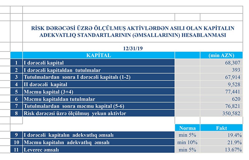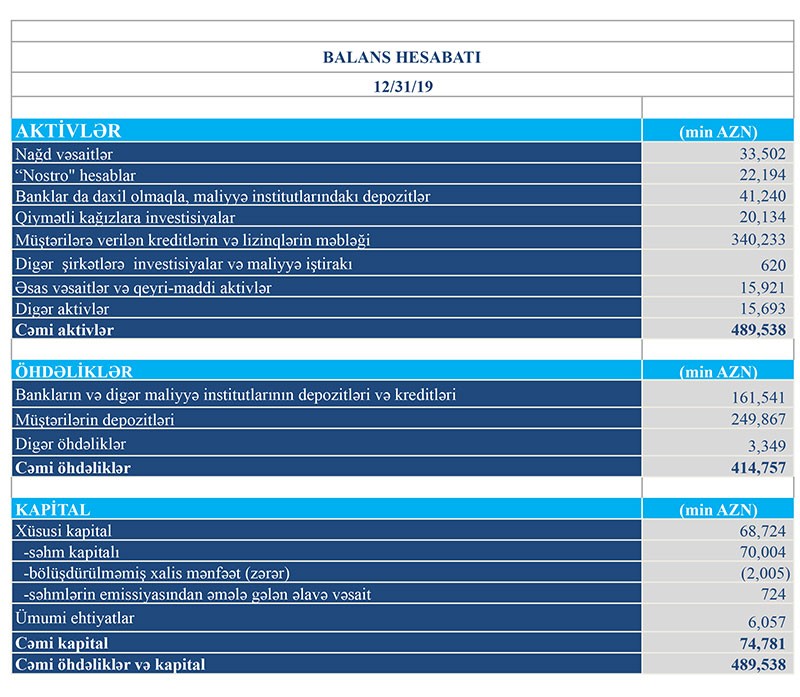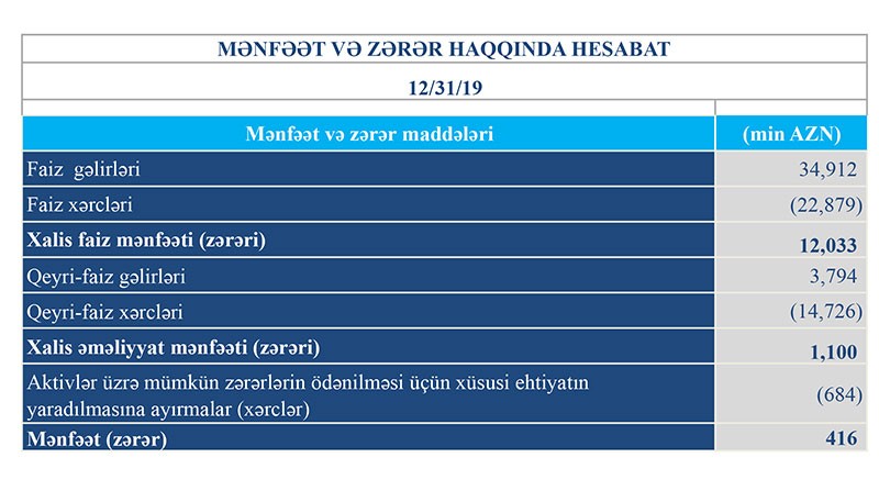 Faiz gəlirləri 2018-ci ildə 30 milyon 931 min manat ikən 2019-cu ildə 34 milyon 912 min manata, qeyri-faiz gəlirləri 2018-ci ildə 2 milyon 994 min manat ikən 2019-cu ildə 3 milyon 794 min manata yüskəlib.