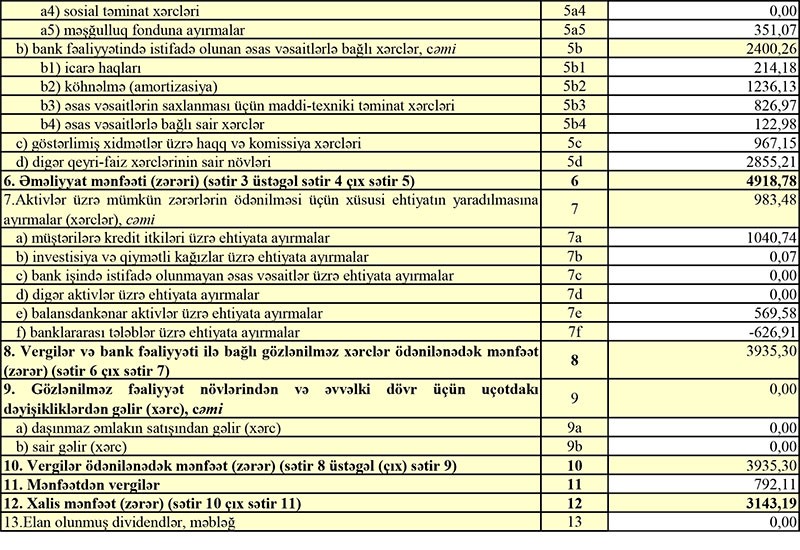 2018-ci ildə 7 milyon 93 min manat əməliyyat mənfəətindən 5 milyon 405 min manat, 2019-cu ildə isə 4 milyon 918 min manat əməliyyat mənfəətindən 983 min manat aktivlər üzrə mümkün zərərlərin ödənilməsi üçün xüsusi ehtiyatın yaradılmasına ayırılıb.